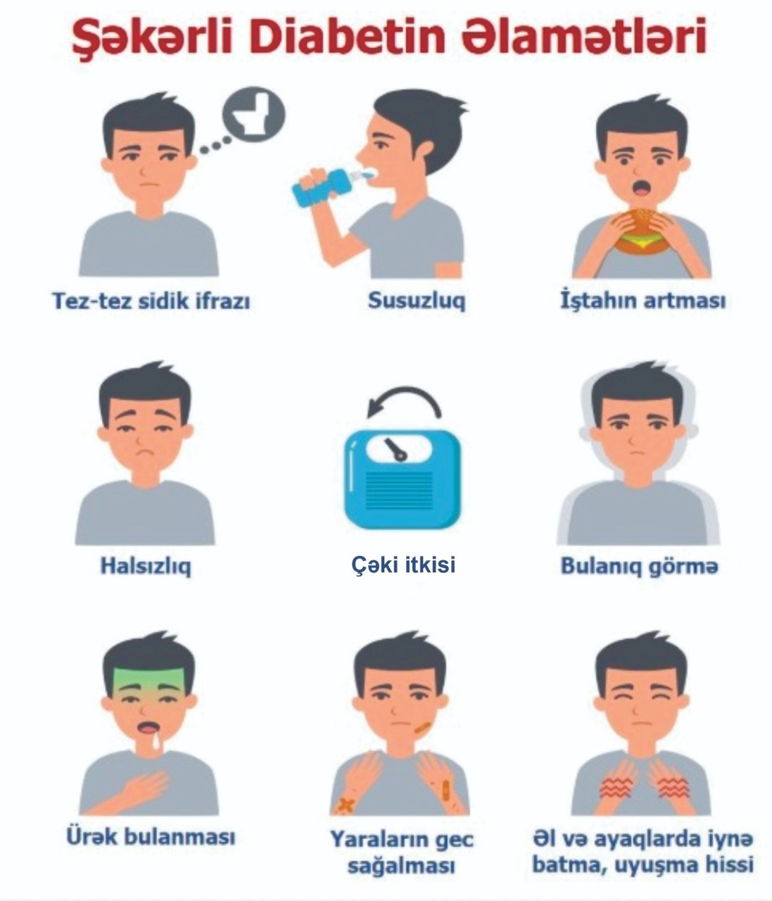 Bu klassik simptomlardan başqa da diabet xəstələrində tez yorulma, görmə bulanıqlığı, dəri infeksiyası, qadınlarda vaginal göbələk infeksiyası kimi əlamətlər də görülə bilər.